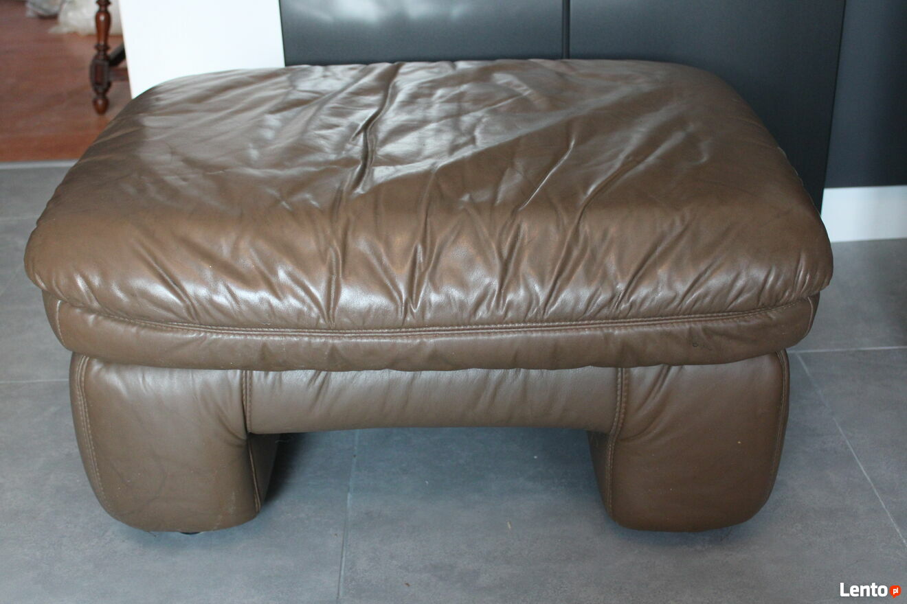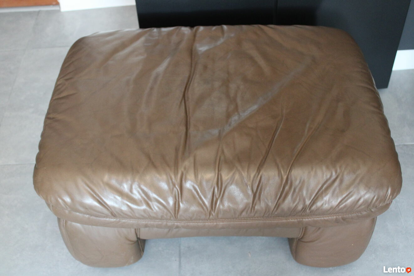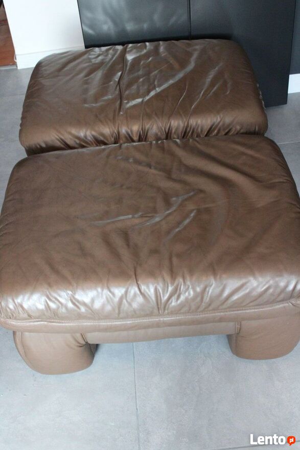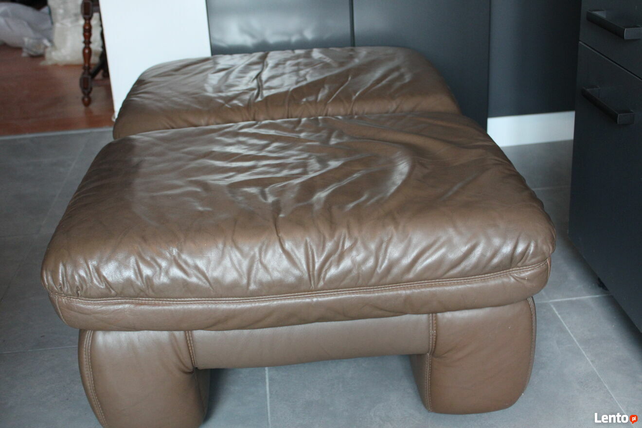Dwa używane pufy tapicerowane skórą naturalną. Meble są w idealnym stanie.Wymiary - ca. 86 cm x 64 cm